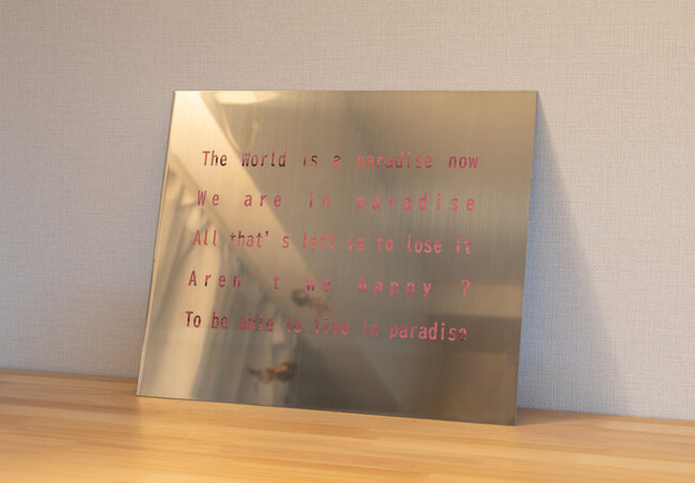 本プロジェクトは、SNSやニュースといった不特定多数を対象とした観察から、個人対個人というミクロな関係性に目を向け、その対話の中で交わされた言葉を引用し、再構成することで作品に昇華しています。展覧会タイトル「楽園の人々」は、「現代において人類はすでに“楽園”に到達しているのではないか」という、ある対話の中で交わされた言葉に着想を得ています。今回の対話の対象者は、いずれも現在の日本に暮らす人々であり、世界の中でも比較的生きやすいと思われる現実の中に生きる私たち自身の姿が映し出されているのかもしれません。