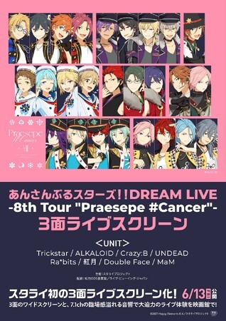 「あんさんぶるスターズ!!」のバーチャルライブ「あんさんぶるスターズ!!DREAM LIVE -8th Tour "Praesepe #Cancer"-」3面ライブスクリーンが、6月13日(金)から7月10日(木)まで丸の内ピカデリー(東京都)、MOVIX八尾(大阪府)、MOVIX広島駅(広島県)、熊本ピカデリー(熊本県)にて公開される。