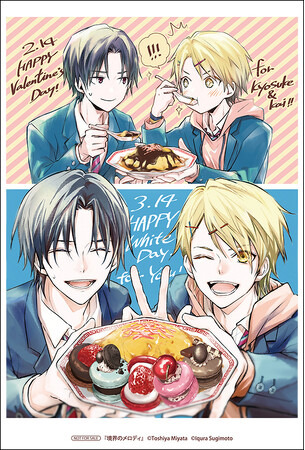 それにあわせて、全国アニメイト・アニメイト通販では「『境界のメロディ』連載開始フェア」を5月2日~6月1日まで開催! 期間中、対象商品を1冊ご購入毎に、杉基イクラ先生によるキョウスケ&カイのホワイトデーお返しイラストを使用した特典「イラストカード(全1種)」を1枚プレゼントいたします。対象商品は、原作『境界のメロディ』ドラマCD付き特装版・通常版と、コミカライズが連載される月刊コミック誌「ヤングエース」6月号の3点です。