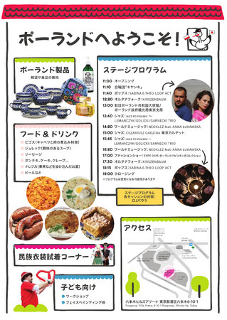 特設ステージではポーランドから来日するポップス、ジャズ、フォーク、ワールドミュージックなどのアーティストたちによるステージプログラムが繰り広げられるほか、子ども向けワークショップ(ぬり絵・工作・フェイスペインティングなど)、ポーリッシュポタリー、民芸品、蜂蜜、コスメ、CD・書籍といったポーランド関連商品の直売ブース、ビゴス、ジュレック、ソーセージ、ポンチキといったここでしか味わえないポーランド料理を提供するキッチンカーの出店など様々なアトラクションをご用意。ポーランドの魅力を丸一日、五感でたっぷりとご体験いただけるイベントです。