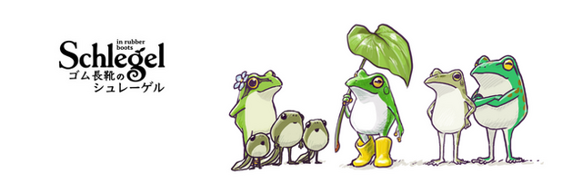 主人公シュレーゲルは、宮沢賢治の童話「蛙のゴム靴」にインスピレーションを得た、黄色い長靴をはいたおしゃれなシュレーゲルアオガエル。