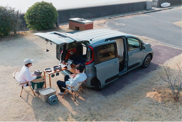 トヨタ シエンタが部屋になるルームキット。走行時は通常の5人乗り、くつろぐ時は大人2人がゆったりくつろげる部屋へとシームレスに切り替えができます。室内、室外で使えるテーブル付きです。