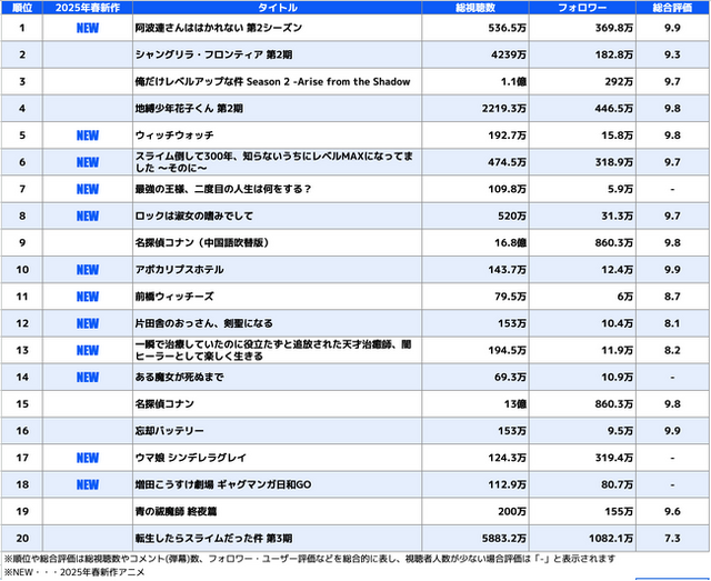 同様にシリーズが継続配信されている作品(例えば『シャングリラ・フロンティア』『地縛少年花子くん』『ウマ娘』『青の祓魔師』『転生したらスライムだった件』など)も累計の総視聴数・フォロワー数が高く、安定した支持を得ていることがわかります。