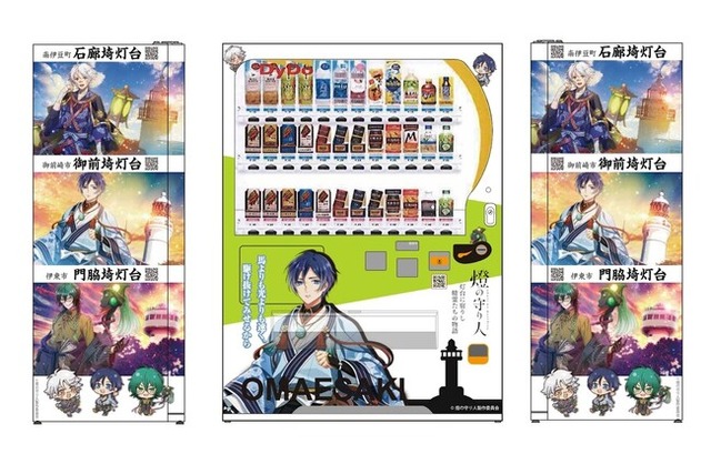 この自動販売機は、燈の守り人のキャラクター活用権を有する御前崎市の地域活性化を目的としており、御前埼灯台(静岡県御前崎市)をメインに、石廊埼灯台(静岡県南伊豆町)と門脇埼灯台(静岡県伊東市)のキャラクターラッピングが施されています。御前崎市を訪れる方々に地域の灯台の魅力を伝え、地域活性化に貢献してまいります。