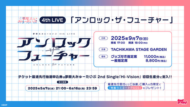 9月7日(日)にTACHIKAWA STAGE GARDENにて、夢限大みゅーたいぷ4th LIVE「アンロック・ザ・フューチャー」の開催が決定しました。また、チケット最速先行抽選申込の受付を、本日21時より開始しました。最速先行抽選申込券は4月30日(水)リリース、夢限大みゅーたいぷ 2nd Single「Hi-Vision」初回生産分に封入されています。