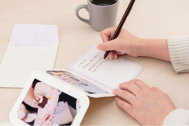 「フォトスタンドカード」は、専用の郵送可能な封筒が一枚セットになっています。封筒内側の細かい部分にもこだわり、カードとリンクしたデザインが施されており、開けた時にも楽しむことができます。お世話になった方や、誕生日やイベントの記念に、大切な写真にメッセージ添えて贈ることができ、様々なシーンでお使いいただけます。