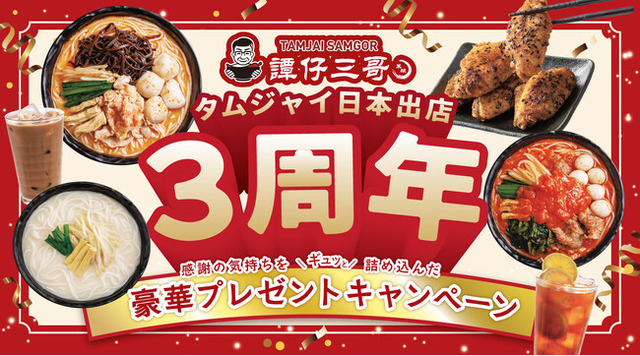 株式会社譚仔三哥日本(本社:東京都渋谷区、代表取締役 劉達民)は、食の感動体験を追求し「一度食べたら忘れられないウマさ。」を提供する香港発のライスヌードル店「譚仔三哥(タムジャイサムゴー)」(以下、譚仔三哥)を展開しています。この度、譚仔三哥は2025年に日本上陸から3周年を迎えることを記念し、 2025年5月9日(金)より、公式インスタグラムおよび店頭にてお客さまへの感謝を込めた豪華プレゼントキャンペーンを実施いたします。