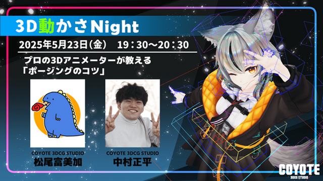 今回のセミナーではMayaでのポージングの基礎についてレクチャーを行います。登壇するのは「COYOTE 3DCG STUDIO」に所属する3Dアニメーターの松尾富美加氏・中村正平氏。実務から学ぶノウハウを解説予定です。ご興味のある方はぜひご参加ください。