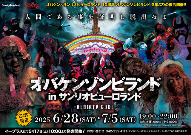 株式会社サンリオエンターテイメント(代表取締役社長:小巻亜矢)が運営するサンリオピューロランド(以下、ピューロランド)は東京方南町を拠点とする方南町お化け屋敷オバケン(以下、オバケン)とタッグを組み、2025年6月28日(土)と7月5日(土)に、一般営業終了後の夜に施設全体を利用したイマーシブホラーイベント「オバケンゾンビランド in サンリオピューロランド - REBIRTHCODE - 」を開催します。