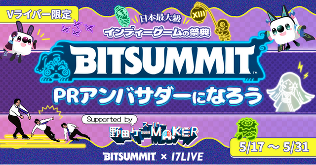『日本最大級インディーゲームの祭典!BitSummit ×17LIVE PRアンバサダーになろうsupported by スーパー野田ゲーMAKER』は、「17LIVE」で活躍中のVライバーで、イベント終了までに認証Vライバーの登録がお済みの方であれば誰でも参加が可能です。上位に入賞した15名のライバーは『BitSummit×17LIVE PRアンバサダー』として「BitSummit the 13th Summer of Yokai」会場でのコラボブースならびに「BitSummit公式配信」への出演権や17LIVE公式特別企画『アンバサダーリレー配信』に出演する権利を獲得します。また、上位5名のライバーには自身の姿で「スーパー野田ゲーMAKER」のゲームキャラクターとして出演できる権利や「BitSummit」オリジナルステッカーへの掲載権なども贈呈されます。