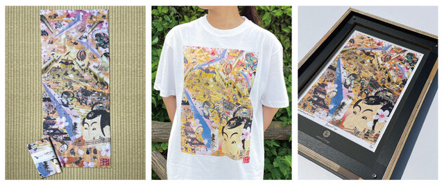 左から)手ぬぐい(かまわぬコラボレーションアイテム)、Tシャツ、A3マット付額絵