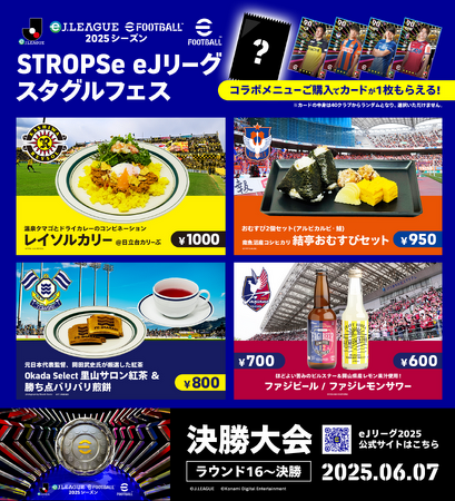 JリーグとKONAMIが共催する公式eスポーツ大会「eJリーグ eFootball(TM) 2025シーズン」の開催を記念したコラボレーションで、柏レイソル、アルビレックス新潟、FC今治、ファジアーノ岡山の計4クラブのスタジアムグルメを提供します。いずれかのスタジアムグルメを注文すると、J1・J2全40クラブのリアル選手カードをランダムで1枚プレゼント!開催期間は6月8日(日)まで。