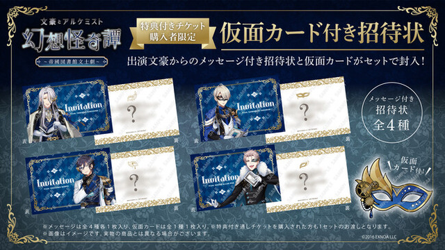 プロフェッショナル・エージェンシー事業を展開する株式会社クリーク・アンド・リバー社(以下C&R社)は6月22日(日)、近代日本文豪をキャラクター化した女性向け文豪転生シミュレーションゲーム『文豪とアルケミスト』(運営:C&R社)の朗読劇『幻想怪奇譚 ~帝國図書館文士劇~』(昼・夜2回公演)を東京・日本教育会館 一ツ橋ホールで開催いたします。この度、特典付きチケットをご購入の方にお渡しする限定特典「仮面カード付き招待状」の詳細情報が決定いたしました。