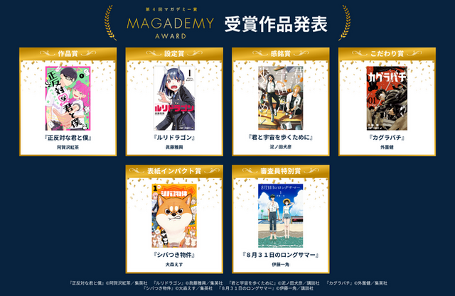 「第4回マガデミー賞」では、<作品賞>に『正反対な君と僕』、<設定賞>に『ルリドラゴン』、<感銘賞>に『君と宇宙を歩くために』、<こだわり賞>に『カグラバチ』、<表紙インパクト賞>に『シバつき物件』が受賞しました。審査員が「この作品こそ推したい」と太鼓判を押す<審査員特別賞>は『8月31日のロングサマー』が受賞し、全6作品の受賞が決定いたしました。
