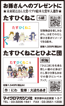 マイクロマガジン社(東京都中央区)は、絵本『たすひくねこ』『たすひくねことひよこ団』を5月15日(木)の朝日新聞に掲載いたしました。