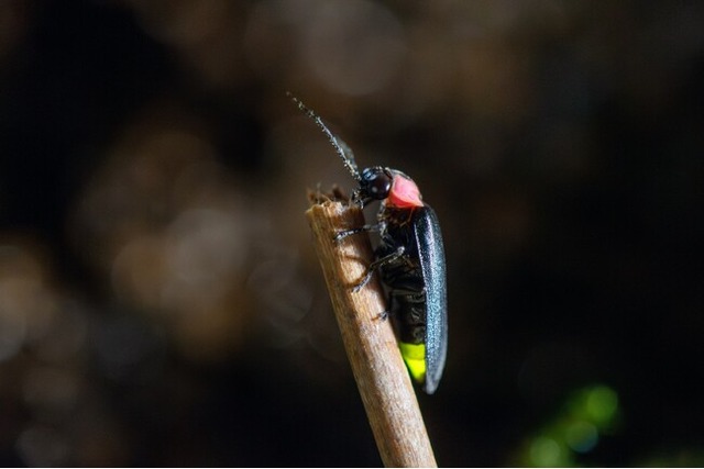 繁殖のパートナーを見つけるために腹部にある発光器を点滅させます。オスはしきりに点滅させながら飛び回るのに対し、メスは草などにとまり、控えめに点滅します。
