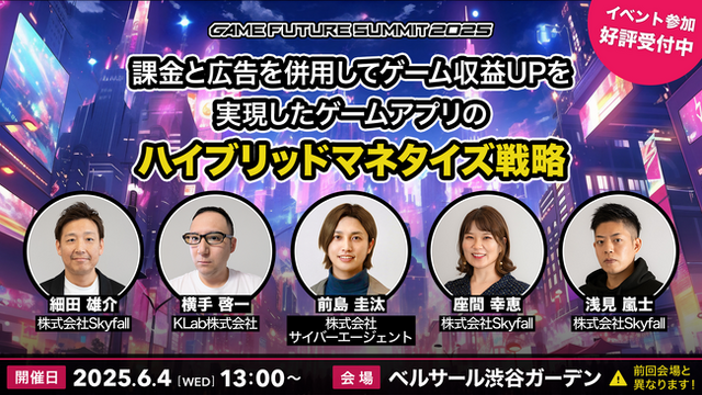 - 名称 :「課金と広告を併用してゲーム収益UPを実現したゲームアプリのハイブリッドマネタイズ戦略」- 日時 :2025年6月4日(水)18:00~18:40 ※18:40より、Skyfallのサービスをご紹介します