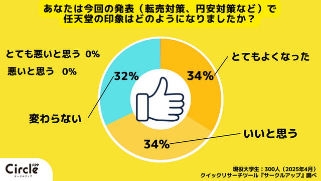 あなたは今回の発表(転売対策、円安対策など)で任天堂の印象がどのようになりましたか?という質問に対し、とてもいいと思うと回答した人は34%、いいと思うと回答した人は34%、変わらない