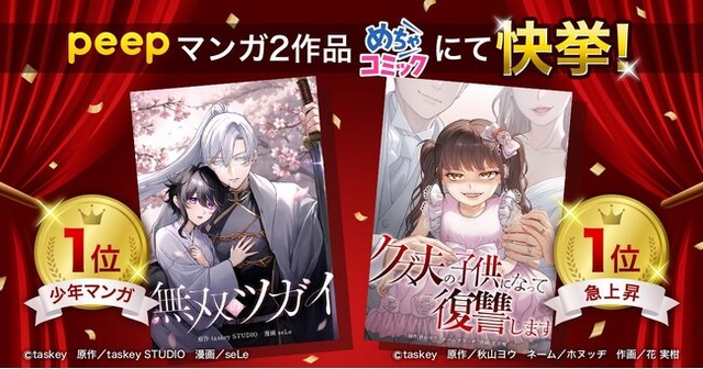 taskey株式会社(本社:東京都新宿区、代表取締役CEO:大石弘務)が発行する、マンガ『無双のツガイ』(原作:taskey STUDIO / 漫画:seLe)、『クズ夫の子供になって復讐します』(原作:秋山ヨウ / ネーム:ホヌッヂ / 作画:花 実柑)が、独占先行配信をしているめちゃコミックにてデイリーランキング1位を獲得しました。