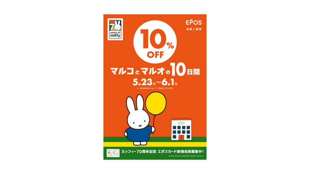 株式会社丸井(本社:東京都中野区、取締役社長:青野 真博)は、2025年5月23日(金)~6月1日(日)の10日間、マルイ・モディ全店およびマルイのネット通販「マルイウェブチャネル」にて、エポスカード会員ご優待キャンペーン『マルコとマルオの10日間』を開催いたします。期間中、エポスカードのクレジットでのお支払いで、10%OFFにてお買物いただけます。また、今回の『マルコとマルオの10日間』は、ミッフィー70周年を記念してコラボレーション企画を実施いたします。