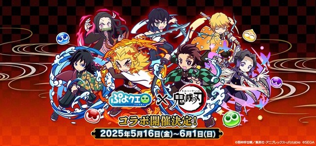 株式会社セガは、大好評配信中のパズルRPG『ぷよぷよ!!クエスト』(以下、『ぷよクエ』)にて、アニメ「鬼滅の刃」とのコラボレーションイベントを、本日2025年5月16日(金)より開催することをお知らせします。