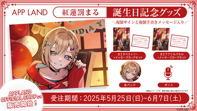 5月25日(日)に誕生日を迎える紅蓮罰まるの誕生日記念グッズ&ボイスを、当社が運営する公式グッズ販売サイト(APPLAND OFFICIAL SHOP)にて販売いたします!記念ボイスにはVRバージョンが用意されており、BOOTH上でも購入可能です。ここでしかゲットできない誕生日限定グッズ&ボイスをお楽しみください!