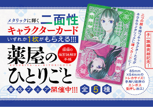 小学館版のコミカライズ『薬屋のひとりごと~猫猫の後宮謎解き手帳~』対象商品を1冊購入するごとに、キラキラとメタリックに輝く「二面性キャラクターカード」(全5種)のいずれか1枚がもらえます!