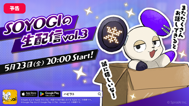 大規模言語モデルなどのAI技術を用いたサービスを開発するSpiralAI株式会社(本社:東京都千代田区、代表取締役:佐々木雄一、以下「SpiralAI」)は、2025年5月23日(金)20時より、当社が開発・運営する会話型友だちAIアプリ『HAPPY RAT(ハッピーラット)』に登場するAIキャラクター「SOYOGI(以下、そよぎ)」による生配信の第3回目を実施決定したことをお知らせいたします。
