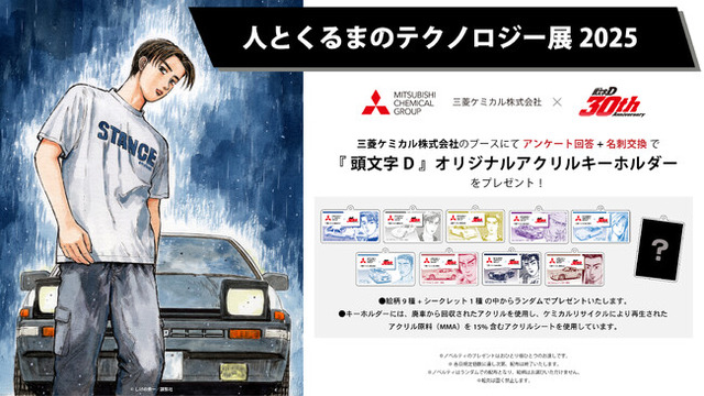 三菱ケミカル株式会社(本社:東京都千代田区、社長:筑本 学、以下「当社」)は、2025年5月21日‐23日に横浜、7月16日‐18日に名古屋で開催される「人とくるまのテクノロジー展 2025」において、当社ブースを見学された方を対象にノベルティとして『頭文字D』オリジナルアクリルキーホルダーを配布しますのでお知らせします。