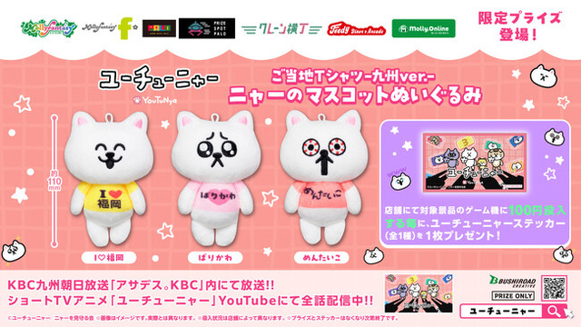 株式会社イオンファンタジー(本社:千葉県千葉市、代表取締役社長:藤原徳也、以下、当社)は、KBC九州朝日放送「アサデス。KBC」内で放映のTVアニメ『ユーチューニャー』のプライズゲーム用景品「ユーチューニャー ニャーのマスコットぬいぐるみ ご当地Tシャツ-九州Ver.-」を、九州北部地方限定(一部山口県内店舗も含む)で「モーリーファンタジー」等のアミューズメント施設において5月30日(金)より順次展開いたします。