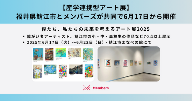 DX現場支援で顧客と共に社会変革をリードする株式会社メンバーズ(本社:東京都中央区、代表取締役社長:高野 明彦、東証プライム:2130、以下「メンバーズ」)は、福井県鯖江市と共同で、メンバーズの障がい者アーティスト社員(以下「アーティスト社員」)による42作品と、福井県鯖江市の小・中・高校生の30点以上の作品を展示するアート展「僕たち、私たちの未来を考えるアート展2025」を2025年6月17日(火)から6月22日(日)に開催します。本展覧会は、気候変動問題などの社会課題をテーマにアーティスト社員が制作した作品を、展覧会やSNSを通じて発表する「Social Art Japan」プロジェクトの取り組みの一つで、2021年から福井県鯖江市と共同で開催しています。4回目となる今年は、アーティスト社員の作品と、鯖江市制70周年を記念し「鯖江の未来」をテーマに生徒たちが制作した作品の他、サステナブルアーティスト吉田 ときお氏の作品なども展示予定で、誰でも無料で観覧することができます。