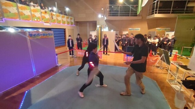 Cyber KASSENは、プレイヤーがウェアラブルセンサーを装着し、デジタルで自動判定される“デジタルチャンバラ”。1対1だけでなく、複数人同時の集団戦も可能で、ルールがシンプルで分かりやすく、年齢や運動経験を問わず楽しめるのが特徴です。