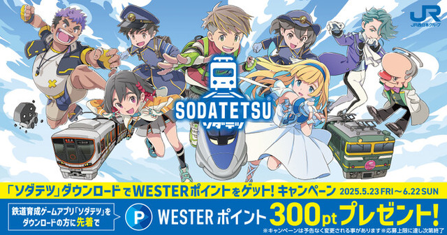 JR西日本グループが企画し、株式会社ジェイコンテンツが開発・運営する新感覚鉄道育成ゲームアプリ『ソダテツ』は、2025年5月23日(金)から6月22日(日)までの期間限定で、期間中に新規で『ソダテツ』をダウンロードされた方、先着5,000名様を対象に、300ptのWESTERポイントをプレゼントするキャンペーンを実施いたします。