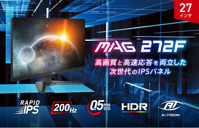 この度、エムエスアイコンピュータージャパン株式会社は2025年6月3日(火)より、ゲーミングモニターの新モデルを発売いたします。高いゲーミング性能とコストパフォーマンスに優れた『MAG』シリーズから、初めてのゲーミングモニターにお勧めな27インチフルHD解像度、RAPID IPSパネル、フレッシュレート200Hz、応答速度0.5ms(GTG、最小値)の「MAG 272F」が新たにラインナップに加わります。