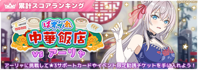 5月25日(日)よりイベント「ぱずでれ中華飯店VSアーリャ」を開催します。当イベントでは、期間中の累計スコア順位に応じたランキング報酬が獲得可能です。またイベントマップで集めたポイントで、イベント限定のサポートカードやアイテムが獲得できる交換所も登場。繰り返し挑戦してよりたくさんのポイントを集め☆3サポートカードや勧誘チケットを手に入れよう!