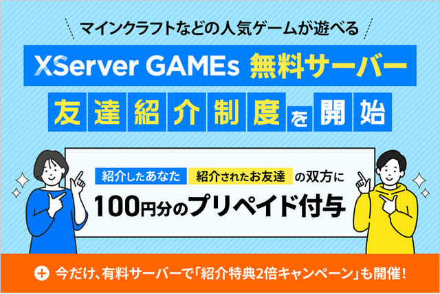 エックスサーバー株式会社(所在地:大阪市北区、代表取締役:小林 尚希)は、ゲームサーバー専用サービス『XServer GAMEs』において、「マインクラフト」などの人気ゲームに対応した無料マルチプレイサーバーを紹介するだけで、紹介した方・された方の双方に100円分のプリペイドが付与される友達紹介制度を開始しました。
