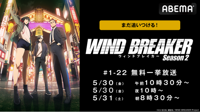 新しい未来のテレビ「ABEMA」は、2025年5月30日(金)、31日(土)に、大人気ヤンキーアニメ『WIND BREAKER』を第1話から最新話まで全話無料一挙放送いたします。