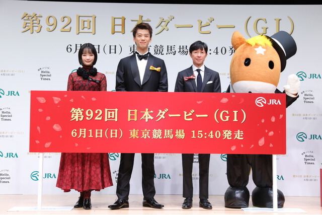 日本中央競馬会は、2025年6月1日(日)に開催される「第92回 日本ダービー(GI)」をより楽しんでいただくため、JRA年間プロモーションキャラクターを務める俳優の見上愛さん、竹内涼真さん、そして騎手の武豊さんをお迎えし、「第92回 日本ダービーPR発表会」を、5月26日(月)に都内で開催しました。当日は、抽選で選ばれた競馬ファン約200名も観覧しました。
