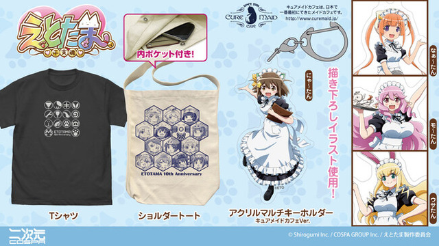 CURE MAID CAFE(キュアメイドカフェ)の制服を身にまとった にゃ~たん たちの「アクリルマルチキーホルダー」、渡辺明夫氏によるえとたま10周年記念イラストを使用した「アクリルスタンド」も同じくラインナップいたします。
