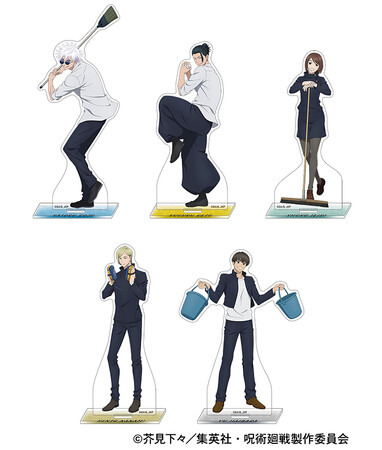 その劇場版総集編「呪術廻戦 懐玉・玉折」が公開されることを記念して、新商品が5月30日より順次発売! 掃除中(?)の五条、夏油、家入、七海、灰原の描き下ろしイラストを使用した「アクリルスタンド」「キャラバッジコレクション」や、“雨の日”をテーマにした描き起こしイラストの「ぺたコレクション」「アンブレラチャーム」など、多数の商品をラインナップしています。