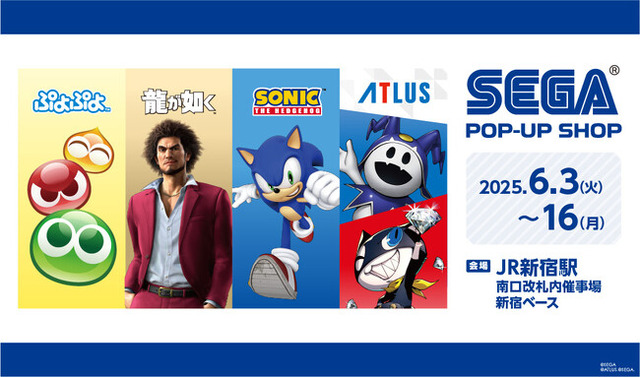 『龍が如く』『ソニック・ザ・ヘッジホッグ』『ぷよぷよ』『ペルソナ』シリーズをはじめ、セガ・アトラスタイトルの雑貨、アパレル商品を揃えたPOP-UPストアがJR新宿駅構内に登場!