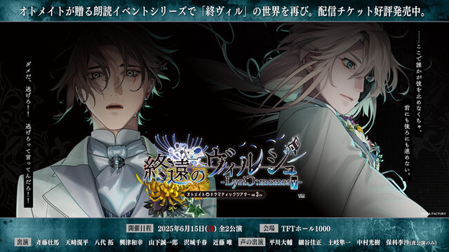 アイディアファクトリー株式会社(代表取締役社長:佐藤 嘉晃/所在地:東京都豊島区)の女性向けゲームブランド「オトメイト」は、2025年6月15日(日)に開催するオトメイトドラマティックシアターvol.03re「終遠のヴィルシュ -LyriC:memory-」の前回公演であるオトメイトドラマティックシアター vol.03「終遠のヴィルシュ -RequieM:memory-」の映像を配信開始いたしました。