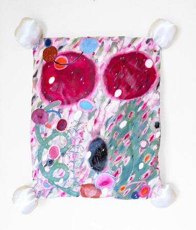 壁に飾る絵画を飛び出させ、触れ合いやすい形にすることで、私なりに親しみを持つことができるような作品を目指して始めたシリーズです。油絵具を塗り広げた時の伸びやかな感覚と、自然に包まれて体が溶け出すような感覚を重ねて描いています。「Pan mimi」と名付けたクッションを四隅に縫い付け、中に通した針金によって好きな形に変形させることができます。