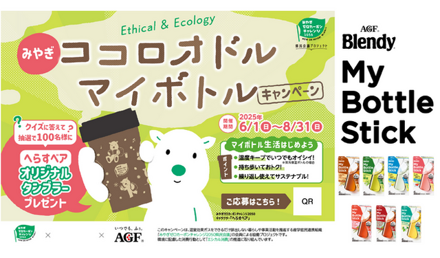 「ココロとカラダの健康」への貢献を目指す味の素AGF株式会社(代表取締役社長:島本 憲仁 以下、味の素AGF)は、宮城県が設立した「みやぎゼロカーボンチャレンジ2050県民会議」に参画し、環境月間が始まる2025年6月1日(日)より、会員による協働プロジェクト第1号として「みやぎ“ココロオドル・マイボトル”キャンペーン」を展開し、県内各スーパーでの普及啓発とマイボトルプレゼントキャンペーンを実施します。