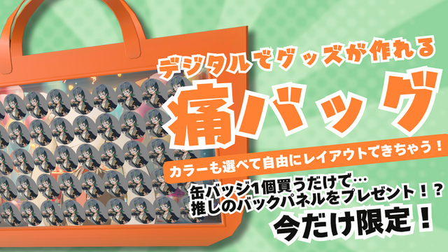 バーチャル痛バッグとは、V-tampが提供するデジタル推し活グッズをバーチャル空間上に飾る機能を利用し、購入したデジタルグッズをバッグ型のオブジェクトに飾りつけるシステムです。同時発売のバーチャル缶バッジを1つでも購入することで限定の痛バッグがアンロックされます。Vtuberの缶バッジを購入するとVTuberに対応したオリジナル背景を利用可能となります。今まで購入したデジタルグッズを含め、たくさんのアイテムを飾りつける事が出来ます。これにより推しのデジタルグッズを使用し、ファンの皆さんに新たな楽しみ方を見つけていただける内容となっております。