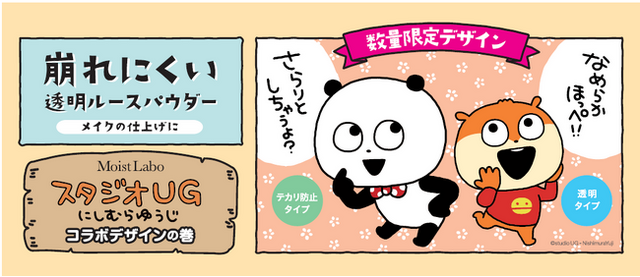 人と地球の美しい未来を創る、桃谷順天館(ももたにじゅんてんかん)グループの株式会社 明色化粧品(めいしょくけしょうひん)(本社:大阪府大阪市 代表取締役社長:桃谷 誠一郎)は、studio UG株式会社(本社:東京都杉並区、代表取締役:にしむらゆうじ・相川 美希)のクリエイター・「にしむらゆうじ」とのコラボでオリジナル描き下ろしイラストの限定デザインパッケージにてモイストラボ ルースパウダー<テカリ防止タイプ><透明タイプ>(全2種)を全国のドラッグストア等で発売することを発表いたします。https://www.meishoku.co.jp/moistlabo/ml_loose/ug/