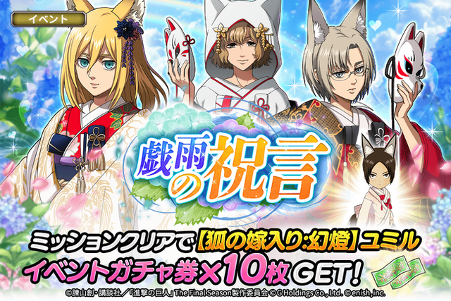 株式会社enish(本社:東京都港区、代表取締役社長:安徳 孝平、以下enish)は、アニメ『進撃の巨人』のスマートフォンゲーム最新作「進撃の巨人Brave Order」にて、2025年5月30日(金)より、「戯雨の祝言」を開催!また、本日より新登場の【狐の嫁入り】クリスタ・レンズ、【狐の嫁入り】ヒッチ・ドリス、【狐の嫁入り】リコ・ブレツェンスカがピックアップされた「戯雨の祝言ガチャ」も開催!その他、最新情報はゲーム公式サイト・ゲーム公式X(旧Twitter)アカウントにて随時公開して行きますので、ぜひご覧ください。