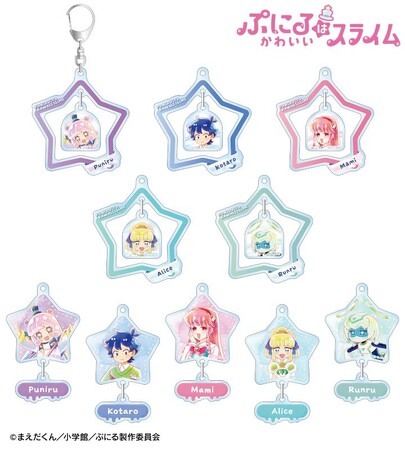 ぷにる、河合井コタロー、雲母麻美、御金賀アリス、ルンルのイラストを新たなタッチで魅力的に表現し、ゆらゆら動くアクリルキーホルダーに仕上げました。