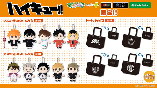 「マスコットぬいぐるみ」では、ジャージ姿の「烏野高校」日向翔陽、影山飛雄、「音駒高校」黒尾鉄朗、孤爪研磨のほか、新たにユニフォーム姿の「青葉城西高校」及川 徹、「白鳥沢学園高校」牛島若利、「梟谷学園高校」木兎光太郎、赤葦京治、「稲荷崎高校」宮 侑、宮 治をラインナップ。