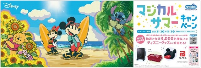 ウエルシア薬局株式会社(本社:東京都千代田区、代表取締役社長:田中純一、以下 ウエルシア薬局)は、ディズニーキャラクターデザイン商品を1,000円(税込)以上購入して応募すると、抽選で3,065名様にディズニーグッズが当たる「マジカルサマーキャンペーン」を2025年6月2日(月)より実施します。また、キャンペーン実施に伴い、ディズニーの大人気キャラクターデザインの限定パッケージ商品も、6月より全国のウエルシアグループの対象店舗※1で順次発売を開始します。